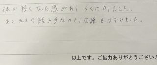 体が軽くなった感があり、らくになりました。あと先生の話上手なのもあり会話もはずみました。